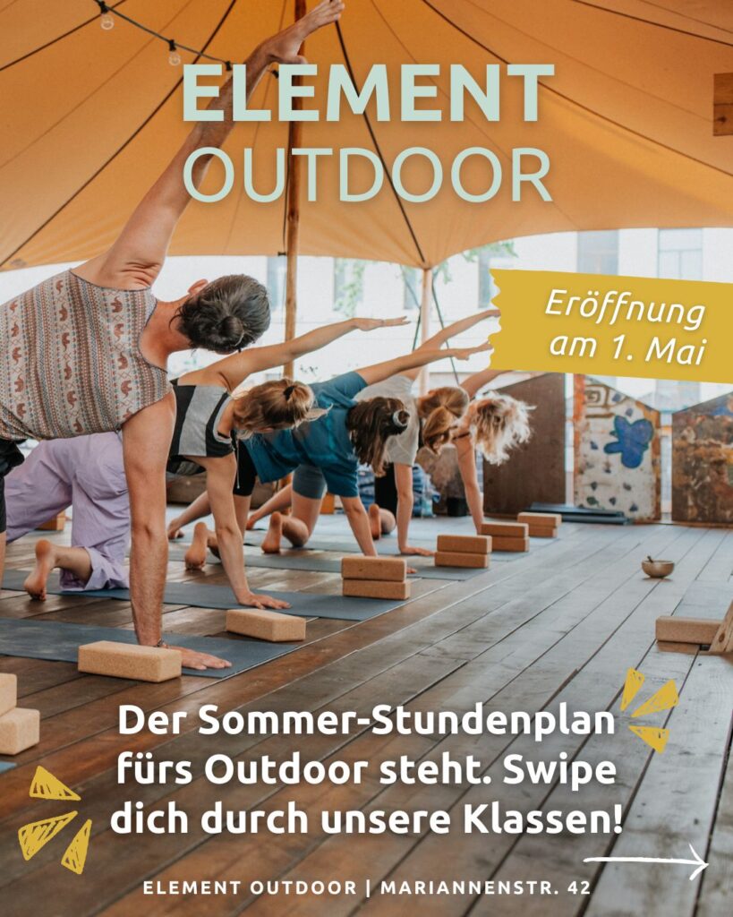 Seit 2018 begleiten wir Menschen in Leipzig auf diesem Weg – in unseren Studios in Neustadt und Eutritzsch, im Sommer im ELEMENT outdoor oder online, wann immer es für dich passt. Mit erfahrenen Lehrer:innen, die dich genau da abholen, wo du stehst. Ob Anfänger:in oder erfahren: Hier bist du richtig.